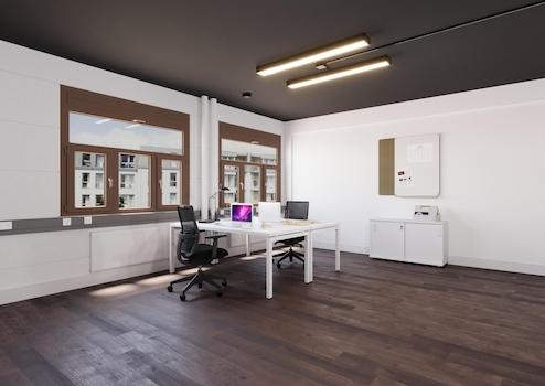 Jedes Büro ist modern und neu eingerichtet und umfassen pro Arbeitsplatz einen Tisch, ergonomischen Drehstuhl sowie nach Auswahl verschiedene Staumöglichkeiten in Form von Schränken.