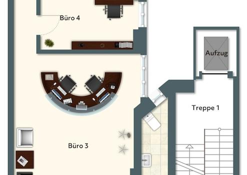 - Bürofläche: 120,00 m² auf 6 Räume aufgeteilt, im 1. Obergeschoss inmitten der Innenstadt