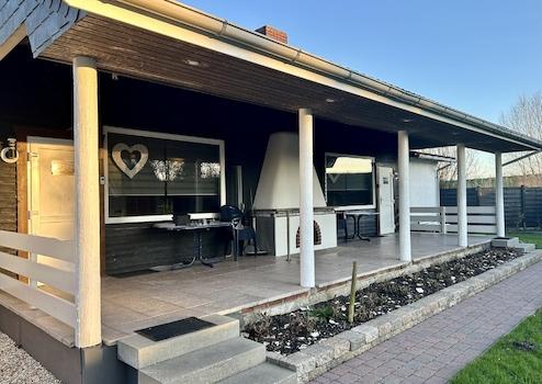 Das Ferienhaus selbst liegt in einem großen Garten mit Terrasse, Sitzgelegenheiten und Spielmöglichkeiten für Kinder, was für entspannte Urlaubstage sorgt.