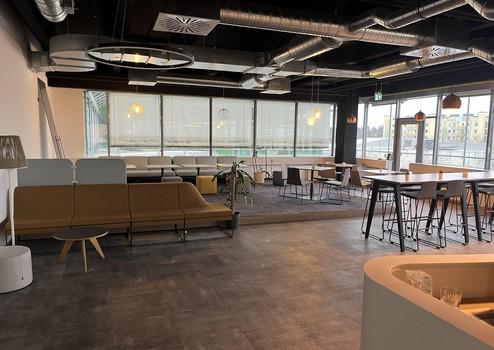 Die Arbeitsbereiche sind mit höhenverstellbaren Schreibtischen und ergonomischen Stühlen ausgestattet, deren Übernahme gegen Aufpreis möglich ist. Ergänzt wird das Raumkonzept durch gemütliche Lounge- und Aufenthaltszonen mit Sofas, Hochtischen, Sitzbänken und Pflanzen. Eine voll ausgestattete Teeküche mit Kühlschrank, Spülmaschine, Wasserkocher und Kaffeemaschine ist ebenfalls vorhanden.