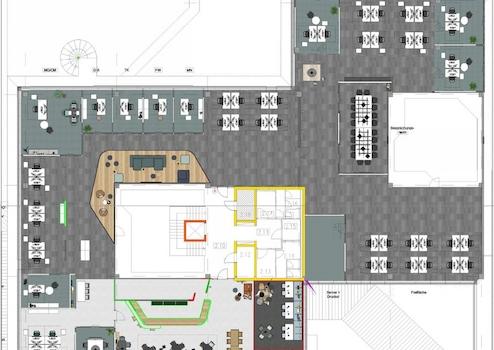 Diese moderne, helle Bürofläche überzeugt durch große Fensterfronten, die für viel Tageslicht sorgen. Eine elektrische Beschattung ist ebenfalls vorhanden. Die Fläche bietet eine gelungene Kombination aus Transparenz und Funktionalität: Mehrere Besprechungs- und Meetingräume, teils mit Glaswänden, sowie 8 Glasbüros ergänzen die offenen Arbeitsbereiche.