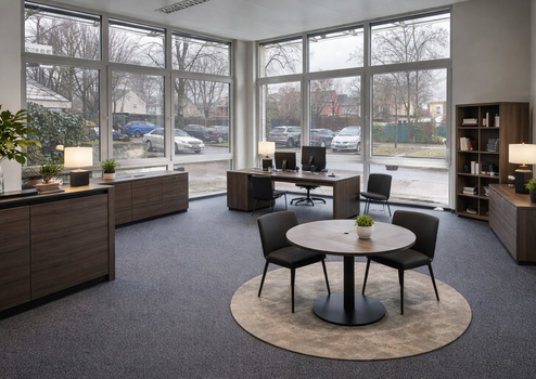 Perspektivisch ist die Einrichtung eines Empfangsbereichs geplant. Dieser soll künftig Ihre Kundschaft professionell begrüßen und in die jeweiligen Büroräumlichkeiten weiterleiten – ein zusätzlicher Mehrwert für repräsentative Geschäftstermine.