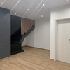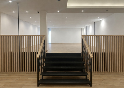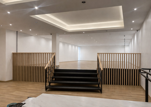Der untere Bereich eignet sich ideal für Empfang, Kundenbereich oder offene Arbeitsflächen. Über eine repräsentative Design-Treppe gelangt man in das Obergeschoss, das sich als ruhiger Arbeits-, Behandlungs- oder Präsentationsbereich nutzen lässt.
