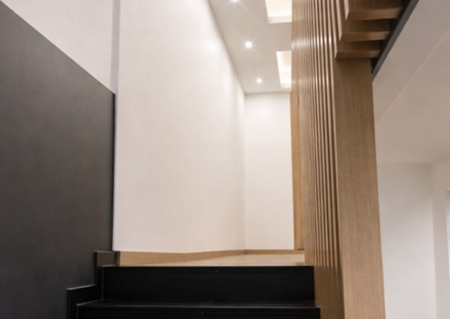 •Architektonische Treppe mit Holzlamellen