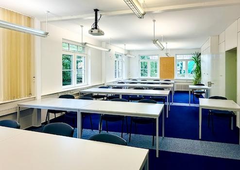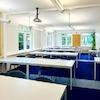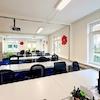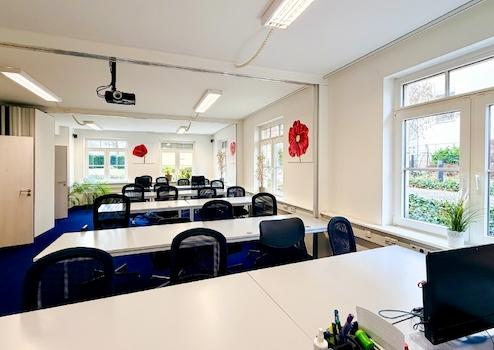 Für optimale Lichtverhältnisse sind entspiegelte Pendelleuchten installiert. Der außenliegende, elektrisch steuerbare Sonnenschutz sowie ein teilweise vorhandener innenliegender Blendschutz gewährleisten ein angenehmes Raumklima und blendfreies Arbeiten.