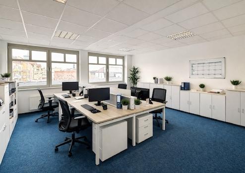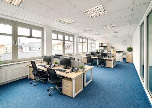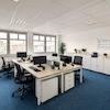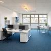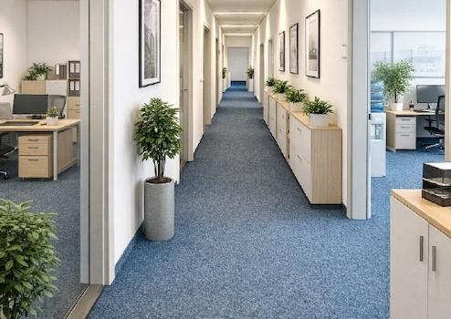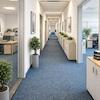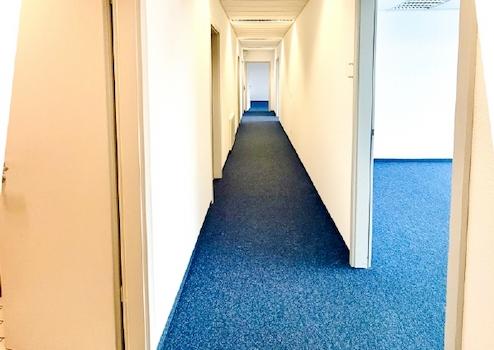 Der strapazierfähige Teppichboden unterstreicht den gepflegten Gesamteindruck und sorgt gemeinsam mit der abgehängten Akustikdecke für eine angenehme Raumakustik. Eine arbeitsplatzgerechte Beleuchtung sowie Bodentanks für die Medienversorgung und eine strukturierte Datenverkabelung ermöglichen eine flexible und effiziente Arbeitsplatzgestaltung.