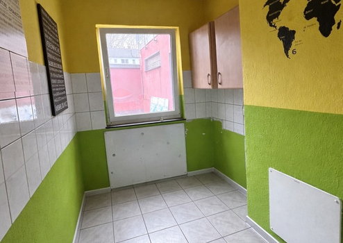 Im hinteren Bereich befinden sich ein Zwischenflur mit Waschbecken, zwei getrennte WCs sowie eine separate Küche mit Fenster.