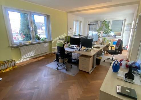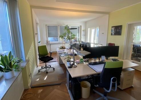 Die Räumlichkeiten im kompletten Erdgeschoss überzeugen durch eine freundliche, lichtdurchflutete Atmosphäre, eine klare Raumstruktur und einen angenehmen Blick ins Grüne. Große Fenster sorgen für viel Tageslicht und ein produktives Arbeitsumfeld.