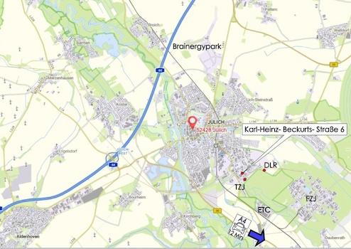 Das Objekt liegt im Gewerbegebiet Königskamp in Jülich – in direkter Nähe zum Technologiezentrum (TZJ) und nur 3 km vom Forschungszentrum Jülich (FZJ) entfernt. Auch das DLR Institut für Solarforschung und die Zuckerfabrik befinden sich im nahen Umfeld.