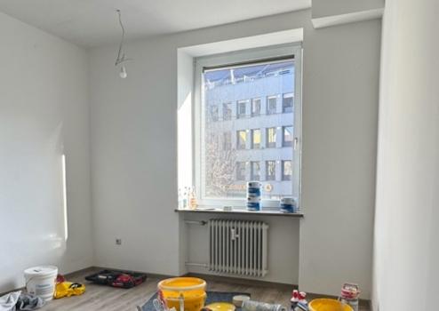 Die Etage wird derzeit umfassend renoviert und modernisiert, um sie technisch und optisch auf den neuesten Stand zu bringen. Die Damen- und Herren-Sanitäranlagen werden vollständig kernsaniert und mit neuen Leitungen, Fliesen und Sanitärobjekten ausgestattet. Sämtliche Büroräume sind inzwischen verkoffert, sodass alle Leitungen und Rohre verdeckt verlaufen. Wände und Decken wurden frisch weiß gestrichen, wodurch ein modernes und gepflegtes Gesamtbild entsteht.