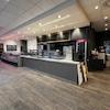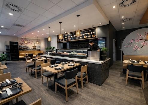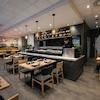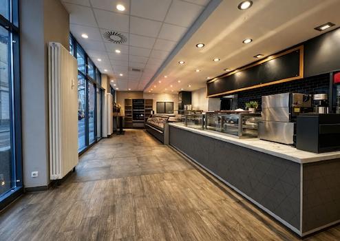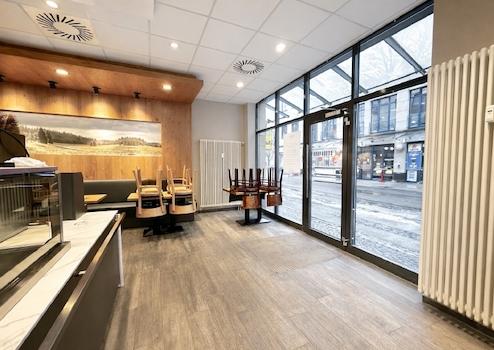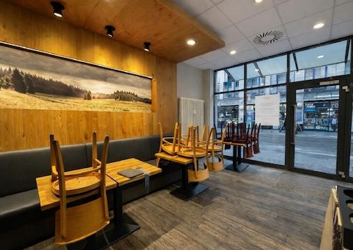 Der Gastraum überzeugt durch eine großzügige Fensterfront, die für eine helle, einladende Atmosphäre sorgt und beste Präsentationsmöglichkeiten bietet.