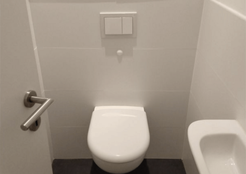 Die Einheit verfügt über ein separates Duschbad mit Waschmaschinenanschluss sowie ein zusätzliches, separates WC. Eine integrierte Einbauküche mit Spülmaschine, Kühlschrank und ausreichend Stauraum ergänzt die funktionale Ausstattung und bietet zusätzlichen Komfort für Mitarbeiter oder Eigennutzer.
