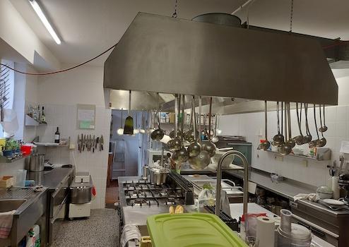 Auf dieser Ebene befindet sich auch die voll ausgestattete Gastroküche mit Spülküche und Kühlhaus. Ausgestattet mit modernen Geräten wie z.B. Konvektomat, Kippbratpfanne, Kühltisch mit 8 Zügen, Spülmaschine usw. 8 Gasflamen, Tellerwärmschrank, Edelstahlmöbel, BainMarie, Inductions-E Herd usw. usw.