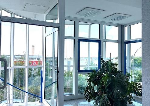 In zwei durch einen spiegelverglasten Verbindungsbau zusammenhängenden Bürokomplexen, modern und hochwertig ausgestattet, stehen Ihnen über zwei Etagen Büro- und/oder Praxisräume teilbar ab 20 m² bis 450 m² zur Verfügung. Büroräume können individuell nach Ihrem Flächenbedarf aufgeteilt werden. Kleinere Büroeinheiten sind ebenfalls möglich. Zur Ausstattung der Räumlichkeiten gehören u.a. bodentiefe Fenster mit Außenjalousien, getrennte Damen- und Herren-Sanitäranlagen, Teeküche und ein Serverraum. Die Räumlichkeiten sind teils mit Teppichböden, teils mit Fliesen ausgestattet. Die innovative Haustechnik bietet ein 3-Kreis-System (Heizen/Kühlen), Designerlampen mit optimaler Beleuchtung sowie Doppelböden. Zum Objekt gehörige Stellplätze befinden sich direkt vor dem Gebäude.