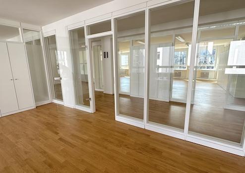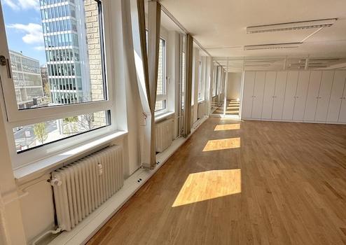 Freundliche, sehr helle und vielseitige Räume in Hamburgs Mitte. Beidseitige Belichtung und Glaswände schaffen transparente Räume im gesamten Objekt. Naturholzboden und Offenheit fördern Raumerlebnis und Wohlbefinden.