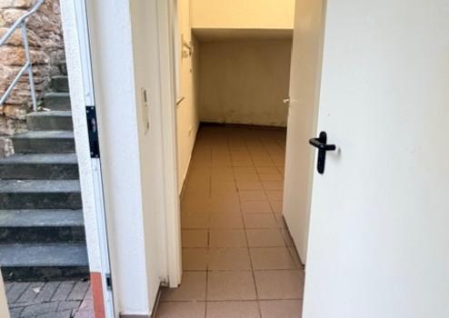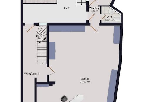 Verkaufsladen mit Eingang, Schaufensterfront, WC, Lager/Büro mit Waschmaschinenanschluss, Flur sowie zweite weitere Eingang/Ausgänge über das Treppenhaus und den Innenhof mit Freisitz.