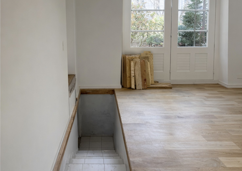 - Stabparkett (Mosaikmuster) in Eiche und Eichenholzdielen im Eingangsbereich