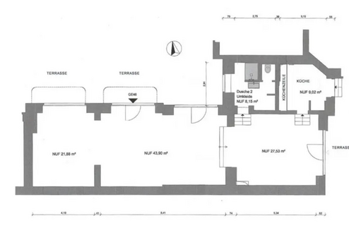 Neben dem großzügigen Arbeits- bzw. Wohnraum verfügt die Einheit über eine Küche mit Einbauküche sowie einen Sanitärbereich mit Toilette und Dusche. Zwei ca. 70 qm große Terrassen und zwei Kellerräume gehören ebenfalls dazu.