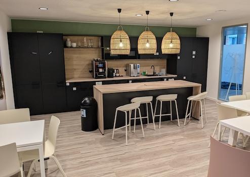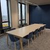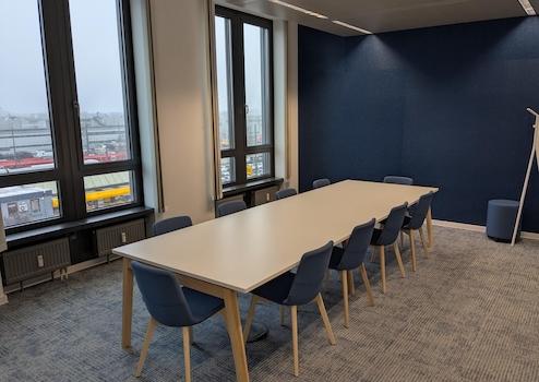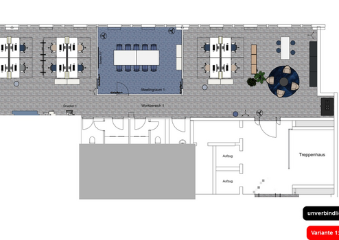 Raumstruktur: Ein heller, moderner Besprechungsraum, Arbeitsplatzbereich jeweils durchbrochen im open space layout