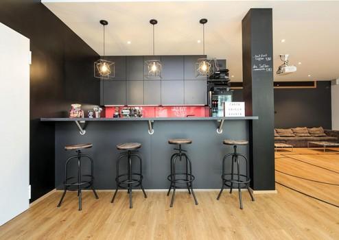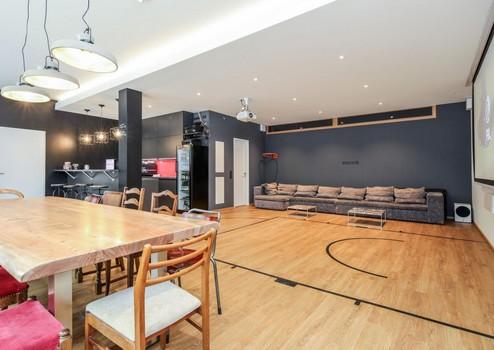 Die Einheit verfügt über einen großzügigen Hauptraum, eine integrierte Küchenzeile sowie Sanitärflächen. Die hochwertige Ausstattung mit Einbauküche, Beleuchtungselementen und Holzfußboden bietet eine angenehme Arbeitsatmosphäre.