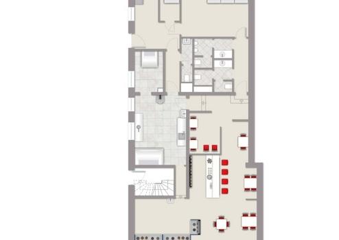 Über den Gewerbeeinheiten befinden sich insgesamt drei Wohneinheiten, die über separate Zugänge erreichbar sind. Die Kombination aus Gastronomie, Dienstleistung und Wohnen sorgt für eine ausgewogene Nutzungsstruktur und bietet eine solide Grundlage für eine nachhaltige Vermietung.