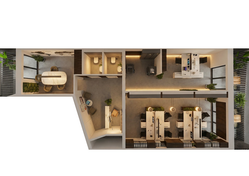 Großzügige, helle Räume mit moderner Architektur, bodentiefen Fenstern und hochwertiger Ausstattung schaffen ein repräsentatives Arbeitsumfeld für Mitarbeiter und Mandanten. Attraktive Terrassenflächen, eine Tiefgarage sowie barrierefreie Zugänge unterstreichen den hohen Qualitätsanspruch dieses Neubaus.