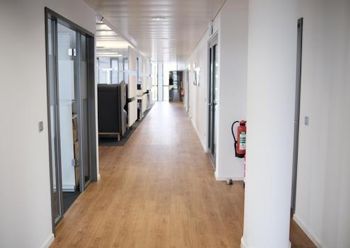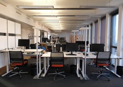• 21 höhenverstellbare Schreibtische, ergonomische Stühle, Meeting-Tische, 2 Flatscreens und Silent-Telefonbox,