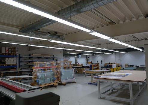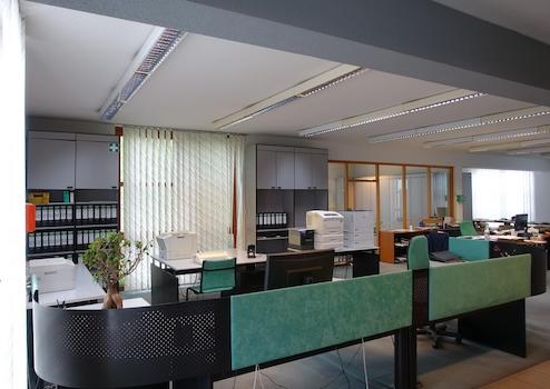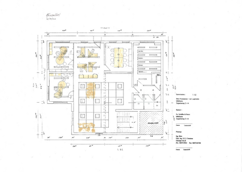 Die bestehende Produktionshalle mit einer Nettofläche von rund 900 m² wurde im Jahr 1983 errichtet und verfügt über eine Hallenhöhe von ca. 3,60 m. Angrenzend befindet sich ein zweigeschossiges Bürogebäude aus dem Jahr 1992, das insgesamt etwa 590 m² Bürofläche auf Erdgeschoss und 1. Obergeschoss verteilt. Die Flächen sind funktional gestaltet und bieten Raum für Verwaltung, Vertrieb oder technische Büros.