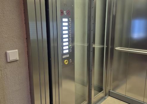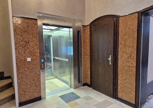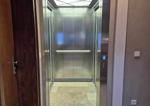 Der neue Glas-Aufzug empfängt im freundlich und wertig in Naturstein