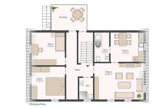 Die Wohnungen im Ober- und Dachgeschoss können sowohl dauervermietet, selbst bewohnt oder umgenutzt werden.