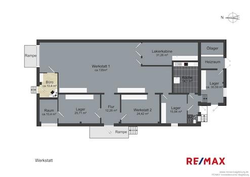 Das freistehende Werkstattgebäude verfügt über eine Grundfläche von ca. 360 m² und gliedert sich in einen großzügigen Werkstattbereich sowie einen angeschlossenen Sozial- und Lagertrakt. Letzterer ist L-förmig in das Gebäude integriert und umfasst Aufenthaltsräume, Nebenräume sowie eine WC-Anlage. Die Gebäudeabmessung beträgt ca. 13 × 28,5 m. Die Immobilie eignet sich ideal für handwerkliche oder dienstleistungsorientierte Betriebe und bietet durch ihre funktionale Aufteilung optimale Betriebsabläufe.