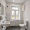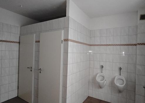 An den Hauptraum schließt sich ein großzügiger Sanitärbereich an, der in separate WC-Anlagen für Damen und Herren unterteilt ist.