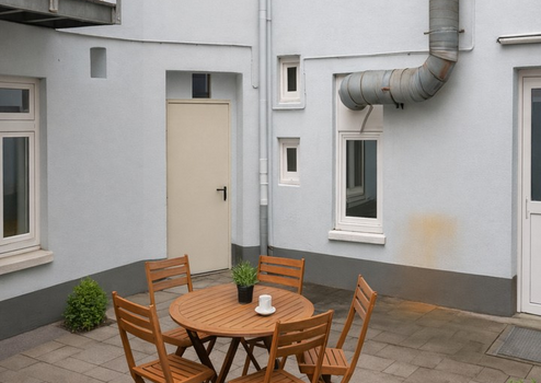 Ein weiteres Plus stellt der angrenzende, großzügige Terrassenbereich im Innenhof dar, der direkt vom hinteren Teil der Gewerbefläche zugänglich ist und sich ideal für eine entspannte Mittagspause oder kurze Erholungsphasen im Freien eignet.