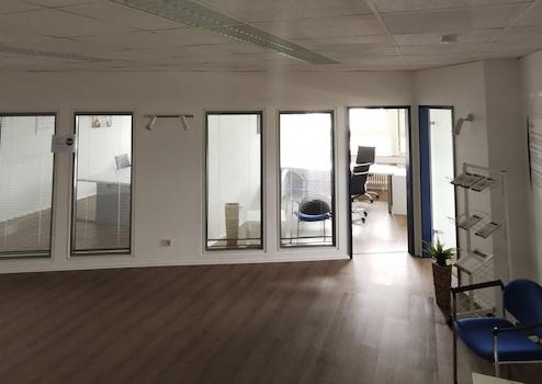 Aufgeteilt ist das Büro einem großen Empfangsraum, 4-6 Büroräumen sowie einem Aufenthaltsraum mit Küche .