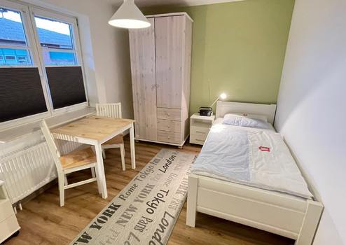 Wohnzimmer-/Schlafzimmer, Abstellraum, Küche mit Einbauküche, Duschbad, Flur,