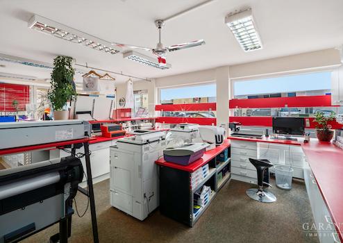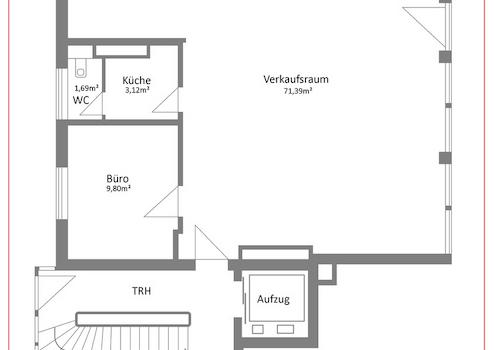 Die Einheit umfasst derzeit eine Gewerbefläche von ca. 86 qm mit funktionalem, flexibel nutzbarem Grundriss. Im hinteren Bereich befinden sich eine Teeküche, ein WC sowie ein separater Büroraum. Die bestehende Struktur ermöglicht sowohl eine sofortige gewerbliche Nutzung als auch eine individuelle Neugestaltung.