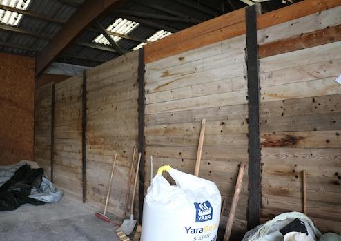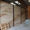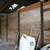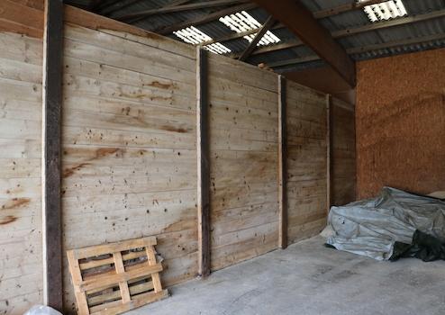 Die Halle ist in einzelne Boxen unterschiedlicher Größe durch Holzbohlen und Holzwände unterteilt.