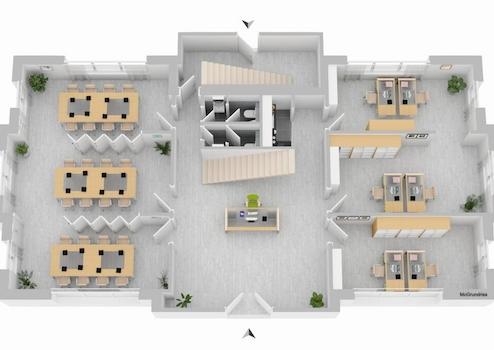 Das Gebäude erstreckt sich über mehrere Ebenen und bietet im ersten Obergeschoss sieben helle, geräumige Büroräume. Im Erdgeschoss befindet sich ein separater Besprechungsraum, ideal für Meetings und vertrauliche Gespräche. Die Büroflächen bieten höchste Flexibilität und können modular als Teilflächen ab etwa 100 m² bis zur gesamten Nutzfläche von circa 220 m² angemietet werden. Diese Flexibilität ist perfekt für wachsende Teams, projektbezogene Strukturen oder innovative Arbeitsplatzkonzepte wie hybride Arbeitsplätze.