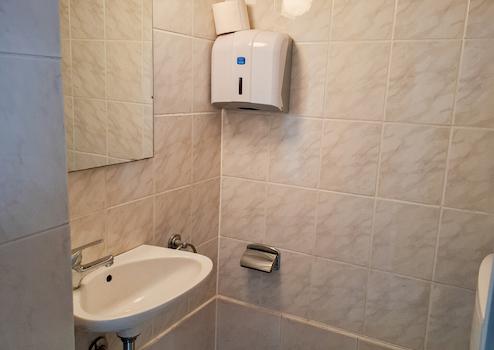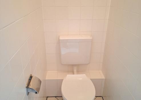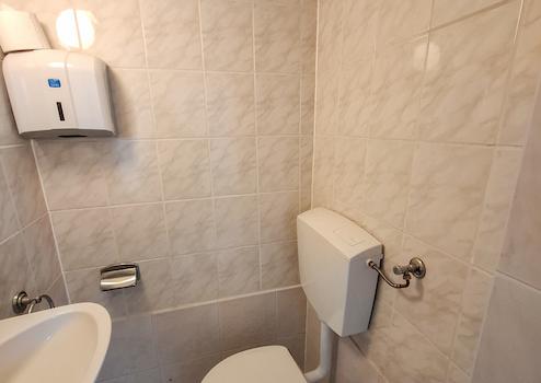 Ergänzt wird das Raumangebot durch zwei angrenzende, geschlechtergetrennte WCs mit gefliestem Boden, die den praktischen Komfort für Mitarbeiter und Kunden erhöhen.
