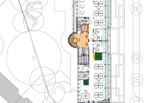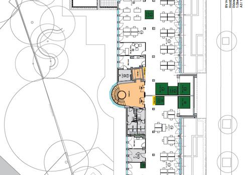 Der Garten erstreckt sich über eine Fläche von 700 m² und steht allen Nutzern zur gemeinsamen Nutzung zur Verfügung. Zusätzlich haben sechs von zehn Mietbereichen direkten Zugang zu Freiflächen wie Loggien, Dachterrassen oder dem Garten. Diese Bereiche bieten die Möglichkeit für Pausen oder auch das Arbeiten im Freien.