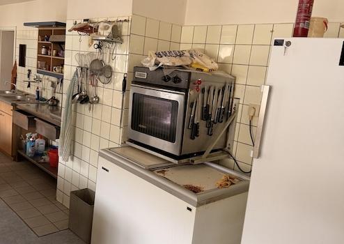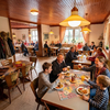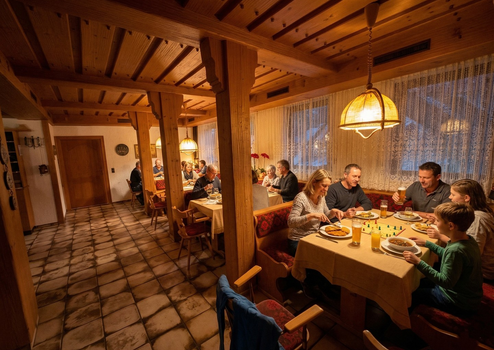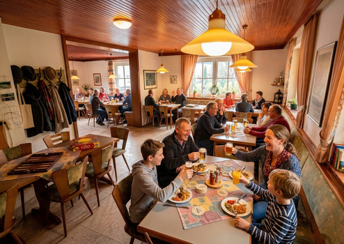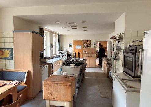 Gastronomie: Voll ausgestattete, funktionale Großküche nach Gastro-Standard (Edelstahl, Dunstabzug). Gemütliche Gasträume mit traditioneller Möblierung.