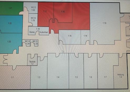 Die angebotene Bürofläche verfügt über moderne, arbeitsplatzgerechte LED Beleuchtung, anthrazitfarbenen Teppichboden und ist mit weißer Raufasertapete tapeziert. Alle Büros wurden einheitlich mit innenliegenden Lamellenjalousien in lichtgrau ausgestattet. Den Mietern stehen eine moderne, voll ausgestattete Teeküche, modernisierte und behindertengerechte Sanitärräume sowie zwei Besprechungsräume für eine gemeinschaftliche Nutzung zur Verfügung. Die Allgemeinflächen werden anteilig zu der angemieteten Bürofläche hinzugerechnet. Beheizt wird das Gebäude mit Gas. Es verfügt über eine neuwertige Brennwerttherme der Marke Viessmann. Bei den Nebenkosten von € 3,00/m² handelt es sich um eine Nebenkostenpauschale, die sämtliche anfallende Nebenkosten umfasst. Lediglich die Kosten für Internet und Telefon sind von jedem Mieter selber zu tragen.