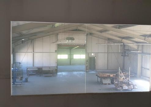 Genug Starkstromanschlüsse. Schwenkkran, Aufenthaltsraum, WC, Küche, Leitstand und großem, elektrischem Rolltor.
