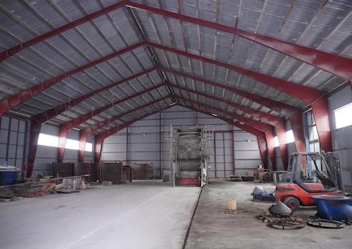 Die Industriefläche ist bebaut mit mehreren Hallen- und Nebengebäuden sowie einem Bürogebäude.
