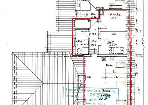 In Hohenlockstedt wird eine großzügige Wohneinheit im 1. Obergeschoss eines gemischt genutzten Gebäudes zur Vermietung angeboten. Die im beigefügten Grundriss rot gekennzeichneten Flächen definieren den Umfang der angebotenen Wohnung.