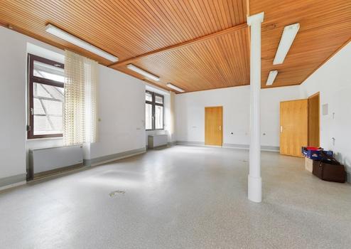 Die dazugehörige Wohnung im Obergeschoss verfügt über insgesamt sechs Zimmer, Küche und Bad.