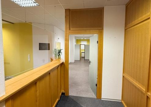 Der angrenzende ehemalige Patienten-Wartebereich mit Garderobe und großen Empfangs-/ Anmeldebereich ist durchaus großzügig geschnitten.
