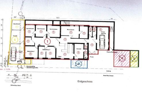 Insgesamt stehen 5 abschließbare Behandlungszimmer (siehe beiliegenden Grundriss) und ein abgeständerter Lagerbereich zur Verfügung.
