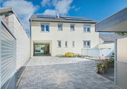 Beidseitig angebautes Einfamilienhaus mit integrierter Doppelgarage und Stellplätzen davor, bestehend aus einem 1-geschossigen Haus mit Unterkellerung und ausgebautem Dachgeschoss. Die Wohnfläche beträgt 151,29 m². ...