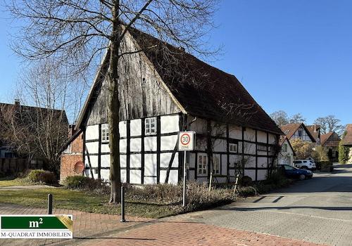 Der Eintritt in das laut Inschrift 1792 aufgerichtete Dreiständer-Bauernhaus erfolgt über die imposante Deele mit mehr als 4 m Deckenhöhe. Von hier aus gelangt man in die Küche, das Wohnzimmer mit Zugang zum Garten ...